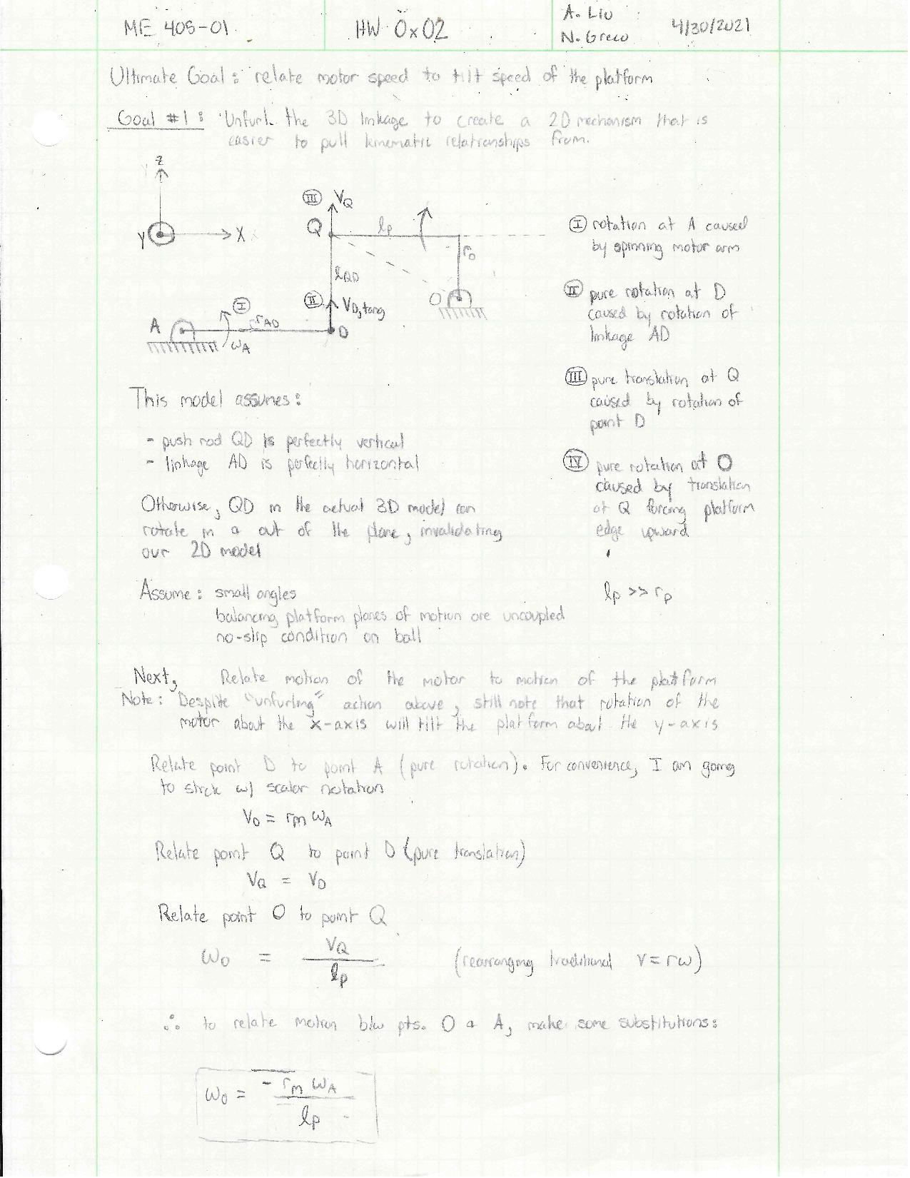 In this assignment, we were required to analyze and derive calculations from a given 4 body linkage. With the final goal being to relate motor speed to the tilt speed of the platform.